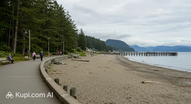The park is a unique blend of a sandy beach, manicured green lawns, and lush wooded areas. It offers everything needed for a comfortable leisure experience, from modern playgrounds and a splash park to cozy picnic spots and an amphitheater for community events. Outdoor enthusiasts will appreciate the famous Willingdon Beach Trail—a gentle, wide 1.2 km path winding through stands of Western Red Cedar and Douglas Fir.