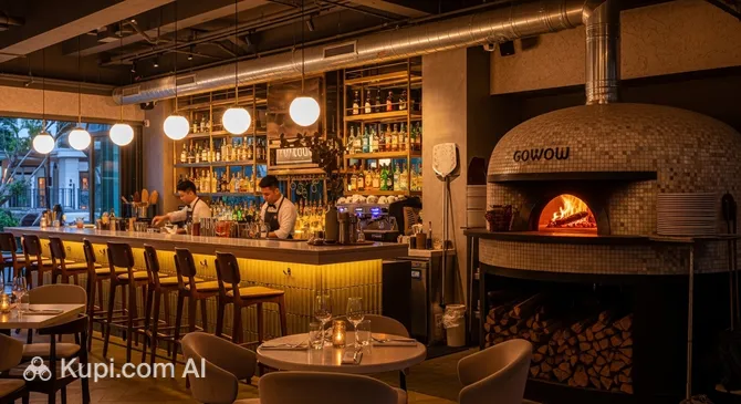 The main feature and heart of this place is the authentic wood-fired oven. Thanks to it, the pizza here acquires that signature crispy crust and light smoky aroma that is impossible to get in electric ovens. GoWow Food Lab Italian Wood-Fired Pizza. Illustration.