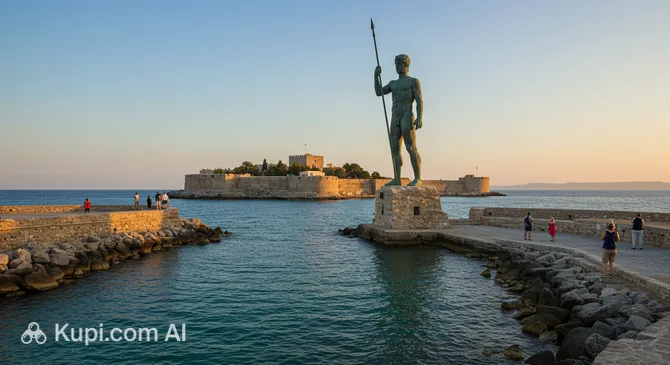Although the massive Colossus of Rhodes was destroyed by an earthquake in 226 BC, its legend continues to define the harbor. Today, instead of the giant sun god, two bronze statues of deer—Elafos and Elafina—stand on columns at the Mandraki harbor entrance, symbolizing the fallow deer that are native to the island's forests.
