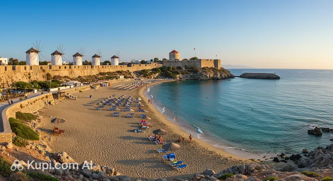 If you prefer to relax by the water, Elli Beach is the city's most famous coastal destination. Situated at the northern tip of the town, this cosmopolitan beach is known for its crystal-clear waters and the iconic diving board that sits offshore. It is a perfect spot to unwind on a sunbed, enjoy water sports, or sip a cold drink at one of the lively beach bars while soaking up the Mediterranean sun.