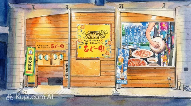 Shimauta Sanshin Live & Agu Pork Shabu-shabu House. Illustration.