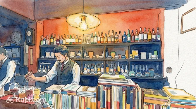 The interior instantly immerses you in an atmosphere of tranquility: soft, dimmed lighting, a massive entrance door, and a long bar counter create the feel of a private club. It is the perfect sanctuary for adult visitors wishing to escape the city noise and spend time in the company of quality literature and impeccably curated sound. The centerpiece here is the counter, where masters craft their drinks like true works of art.