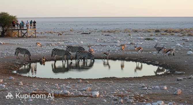 Namibia's greatest treasure is its nature. The ancient Namib Desert, with its famous orange dunes in the Sesriem area, including the renowned Sossusvlei and Deadvlei (the Dead Vlei), captures the imagination. Etosha National Park in the north of the country is one of Africa's best locations for wildlife viewing, where elephants, lions, giraffes, and antelopes gather at waterholes such as the Okaukuejo Waterhole. Namibia's climate is predominantly arid, with many sunny days throughout the year, making it an attractive destination to visit at almost any time.