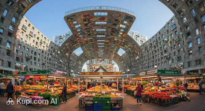A true icon of the city is the Markthal. This spectacular horseshoe-shaped building combines a lively indoor market hall with residential apartments draped over the top. Visitors are immediately drawn to the massive ceiling artwork titled "Horn of Plenty," which spans the entire interior arch. It is a feast for the senses, where you can sample fresh Dutch cheeses and global street food while admiring one of the world's most artistic market spaces.