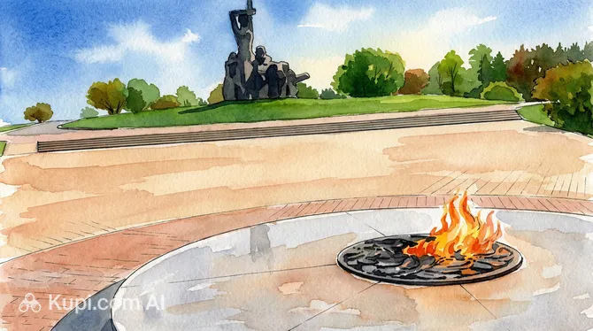 At the center of the complex rises a majestic concrete sculptural ensemble depicting the mourning figures of a woman, a child, and an elderly man. Before the monument, the Eternal Flame burns perpetually, and the surrounding space is permeated with an atmosphere of silence and solemnity. The complex includes sculptures, a hall of sorrow, and symbolic pylons representing the years of the war.