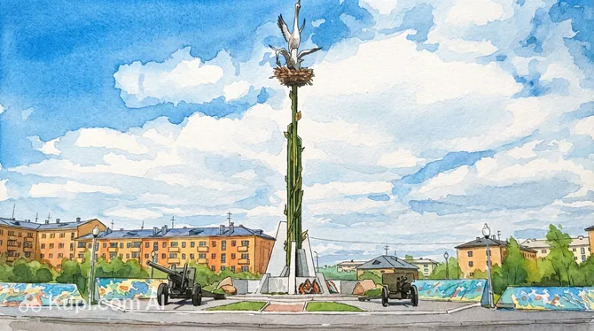 The complex's focal point is an unusual monument where gun barrels, symbolizing military power, are gracefully entwined with vine branches representing peaceful life. A nest with storks, a symbol of hope and the continuation of life, crowns the composition. The entire complex is surrounded by a cozy park, which was created by the efforts of the city's residents in the early 2000s.
