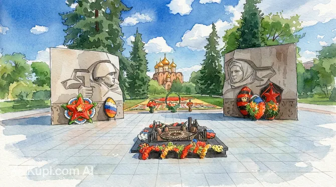 The monument is a unique architectural composition: two massive walls of gray-blue granite with an inextinguishable flame burning between them. The left wall is decorated with a relief of a soldier-defender, while the right is dedicated to a woman-worker, symbolizing the unbreakable bond between the front lines and the home front. A special charm is added to the monument by the fact that the gap between the walls offers a majestic perspective of the Assumption Cathedral.