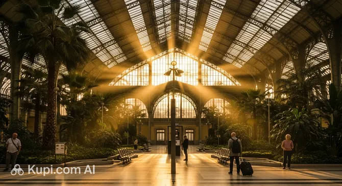 Atocha Station (Estación de Atocha) is the largest railway hub in Madrid and one of the most recognizable stations in Spain. It is famous for its unique architectural design: the historic terminal building was transformed into a magnificent tropical garden, where passengers can relax while waiting for their trip amidst palms and exotic plants. Both commuter trains and high-speed AVE trains depart from here, connecting the capital with Barcelona, Seville, and Valencia.