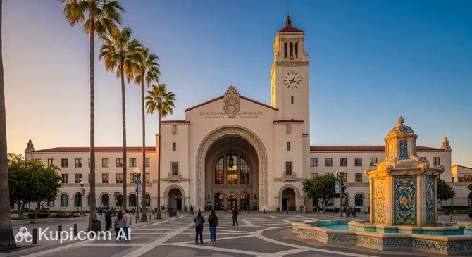 The station building is a unique fusion of Art Deco and Spanish Colonial Revival (Mission Revival) styles. Designed by the Parkinson architectural firm, this masterpiece of marble and wood is surrounded by lush Californian gardens. Its silhouette, featuring a tall clock tower and a long main body, is often compared to an ancient giant standing still amidst a modern metropolis.