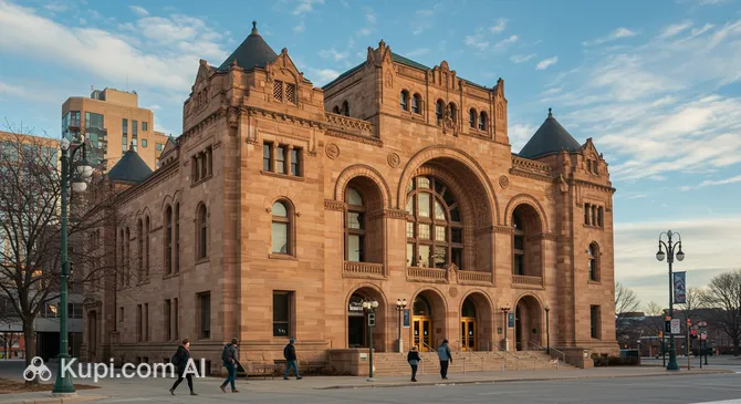 In the heart of the Twin Cities metropolitan area, where Minneapolis is located, rises the majestic Landmark Center. This building, resembling an old castle, is a magnificent example of Richardsonian Romanesque architecture. Built in 1902 in the USA, it originally served as a federal building, housing the post office, customs, and courtrooms under its roof.