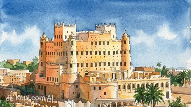 The uniqueness of the site lies in the masterful use of saman — sun-dried clay bricks perfectly adapted to the hot desert climate. Snow-white facades, massive corner towers, and elegant carved windows create the unique look of a "mud skyscraper" that once controlled the legendary incense trade routes.
